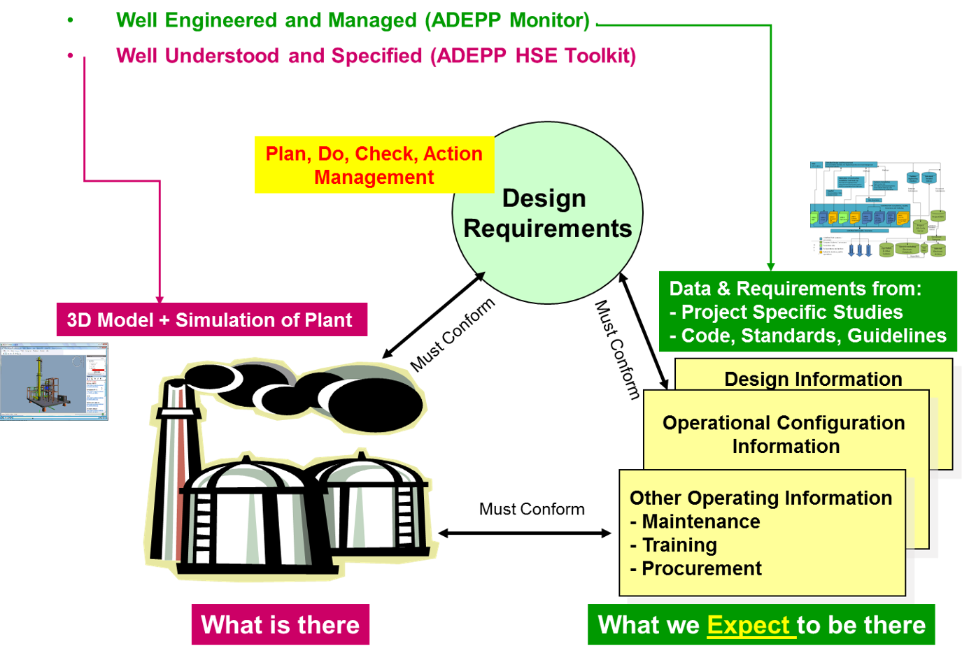 ADEPP monitor is designed to relate the different HSEMS requirements including performance standards to relevant activities and tasks. Several products are derived from ADEPP to suit particular needs. Products that address specific technical applications are currently: ADEPP HSE Case, ADEPP Maintenance Manuals, ADEPP Process Data Audit, and a series of online ADEPP monitors for HAZOP, HAZID, SIL, HSEMS, BOW-TIE, Performance Standards and other project HSE studies.